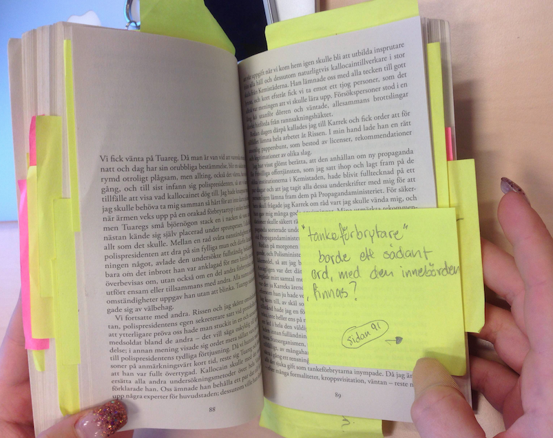 Som jag har berättat om i tidigare inlägg arbetar jag med romanen Kallocain i min klass Ek3b. Läsningen ska mynna ut i att de skriver en kortare vetenskaplig text där de jämför romanen med Brave New World, som de har läst utdrag ur i engelska, och med en valfri dystopisk film. Till lektionen häromdagen skulle eleverna ha läst ut Kallocain. De gjorde det mesta av läsningen hemifrån även om vi under tiden tagit ytterligare ett lektionspass till att diskutera och bearbeta texten. Eleverna hade också fått med sig lite frågor att fundera på under läsningen och skrivit på egen hand i sina portföljer. Den här klassen går ju sin sista termin och jag försöker pusha dem att träffas i studiegrupper någon gång per vecka (vi har lite avsatt tid för den typen av arbete på onsdagar mellan halv fyra och halv fem). Detta är ett universitetsförberedande sätt att plugga, tänker jag.