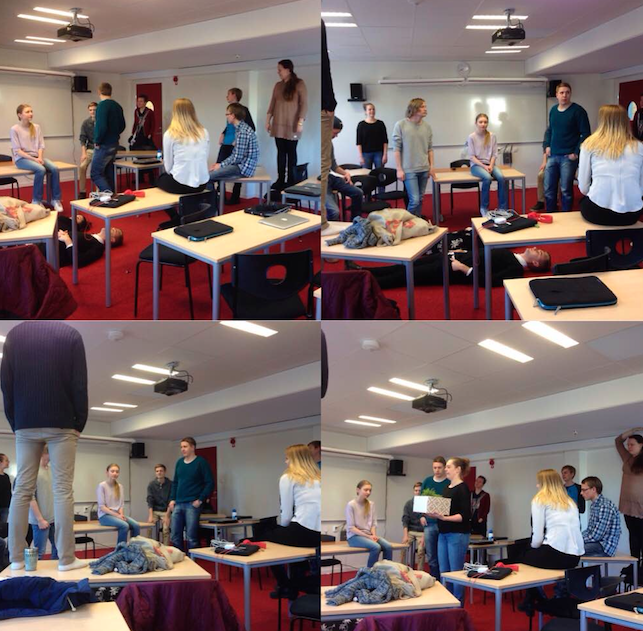 Japp, tittar man noga på bilderna ser man att det ligger elever på golvet också – för att få nya perspektiv. Vilken betydelse har olika perspektiv för oss som retoriker i olika situationer? Det var fokus på dagens lektion.