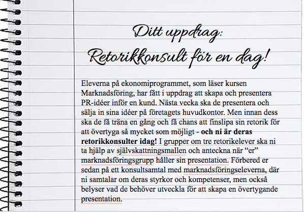 Ellinors elever arbetar just nu med en uppgift i kursen Marknadsföring där de har fått i uppdrag att presentera en affärsidé inför ett företag (”på riktigt”) inne på deras huvudkontor nästa vecka. Dessa elever läser inte retorik men har förberett presentationer där de ska sälja in sin idé till företaget i olika grupper. Idag fick mina retorikelever chans att agera retorikkonsulter till dessa elever. Syftet var att marknadsföringseleverna skulle få chans att framföra på scen inför en provpublik en vecka före det ”riktiga” framförandet men också få konkreta och förhoppningsvis värdefulla tips för att finslipa sina framföranden och presentationer. Retorikeleverna fick prova på att kliva in i en yrkesroll och använda sin retoriska expertis och god samtalsteknik till att ta marknadsföringseleverna till en ny nivå.