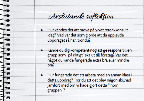 Lektionen avslutades med att mina retorikelever fick reflektera på egen hand kring följande i sina digitala portföljer: