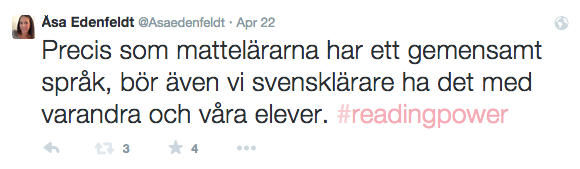 En annan framgångsfaktor i undervisningen hos lärare i British Columbia använder ett gemensamt och korrekt språk för att samtala om och sätta ord på vad läsning innebär. Ett språk för de metakognitiva strategier som används vid läsning har varit av yttersta vikt för lärarna i utvecklingen av läsundervisningen, menar Adrienne. Här tycker jag att hon gör en fantastisk liknelse till matematikämnet och matematiklärarnas språk. Hennes ord åkte direkt upp på twitter: