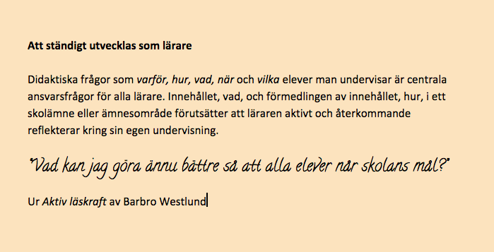Själva listformatet blir ju naturligtvis väldigt kortfattat, men boken fördjupar diskussionen kring de olika punkterna. Listan har varit viktig för mig i mitt reflektionsarbete eftersom den här hjälpt mig hitta utvecklingsområden i min undervisning. Det var framförallt kring läsundervisningen som jag för ett antal år sedan började känna en osäkerhet kring didaktikens hur. Didaktik handlar om, enligt Astrid Roe, att förstå undervisningens vad, hur och varför och när det gäller läsförståelsen har både ”vad” och ”varför” varit klart för mig, men ”hur” har skapat osäkerhet. Hur gör man? Det var inget jag hade med mig från lärarutbildningen på 90-talet i alla fall. Det var till stor del med den frågan i bakhuvudet som den här bloggen kom till – för att sätta ord på och dela dessa funderingar (läs gärna mer om det här). Tack vare alla som hör av sig så har jag förstått att det inte bara är jag som funderar på dessa frågor!