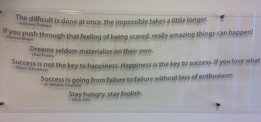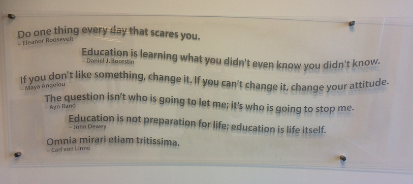 • Livsbejakande ämnen. Sedan några år tillbaka har vi i ämnesgruppen fokuserat på att hitta ingångar i att arbeta med livsbejakande teman, framförallt inom Svenska 1. Eftersom många av de klassiker vi läser handlar om lite tyngre teman har det känts viktigt att hitta en balans. En kollega berättade om ett lyckat upplägg i muntlig framställning som handlade om självkänsla och en annan kollega, Astrid, kom på en fantastisk idé inför nästa läsår. Hon vill arbeta med begreppet ”framgång” och låta eleverna utgå ifrån och ta fasta på de citat om framgång som pryder en av skolans väggar: