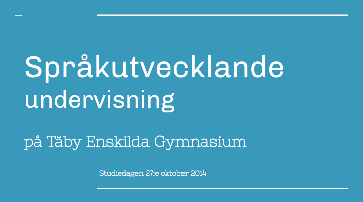På min skola har vi de senaste åren satsat på att initiera en språkutvecklande undervisning i alla ämnen. Jag har lett detta arbete genom att ordna utbildningar, föreläsningar och workshops för alla lärare under flera studiedagar. I den första fortbildningsomgången berörde jag följande innehåll: