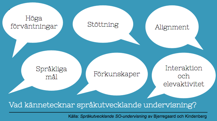 “Att tillägna sig ämneskunskaper förutsätter tillgång till ett specifikt fackspråk och varje nytt ämne har ett karakteristiskt språk. Lärarna ska ställa språkutveckling lika mycket som ämneskunskaper i centrum eftersom en språkinriktad undervisning gynnar alla och inte bara vissa elever menar forskare. Varje skola bör därför hitta sätt att följa upp elevernas språkutveckling, skapa strategier för språkstöd samt presentera en plan för lärarnas kompetensutveckling inom språk- och begreppsutveckling.”