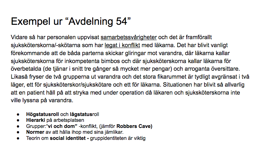 Eleverna fick sedan läsa en gemensam fallbeskrivning och då träna sig på att resonera kring människornas tankar, känslor och beteenden. De fick även skriva enskilt i sina portföljer. Här använde jag fallet ”Avdelning 54” som handlar om en avdelning på ett sjukhus där läkarna och sjuksköterskorna har hamnat i konflikt med varandra. Detta är en övningssituation som visar ungefär var eleverna befinner sig i sitt lärande. Utifrån detta ger jag kort, enskild respons på elevernas resonemang i de digitala portföljerna. Jag ger även lite mer utförlig och kollektiv respons muntligt i klassrummet. Vad kännetecknar ett utförligt svar, till exempel? Eventuellt visar jag olika exempel på svar.