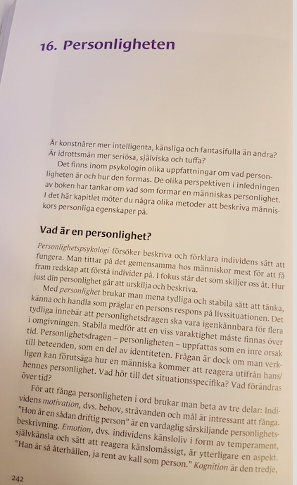 Utöver ovanstående punkter har jag noterat att läromedlen på marknaden skiljer sig åt rätt mycket, inte främst när det gäller innehållet utan språket. Jämför till exempel nedanstående utdrag ur tre olika läroböcker. Detta är första sidan ur kapitlet om personligheten, eller olikheternas psykologi, ur respektive lärobok: