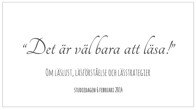 - Studiedag februari 2014: Lässtrategier för effektivt lärande. Vad är lässtrategier och hur kan vi använda oss av dessa i olika ämnen i gymnasieskolan? Vad är läskompetens och hur blir våra elever läskompetenta? Hur kan vi stötta elevernas läsning av avancerade och ämnesspecifika texter?