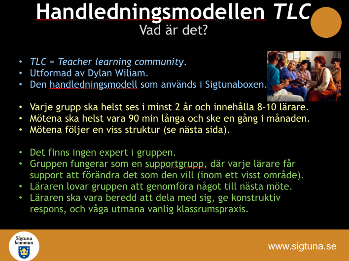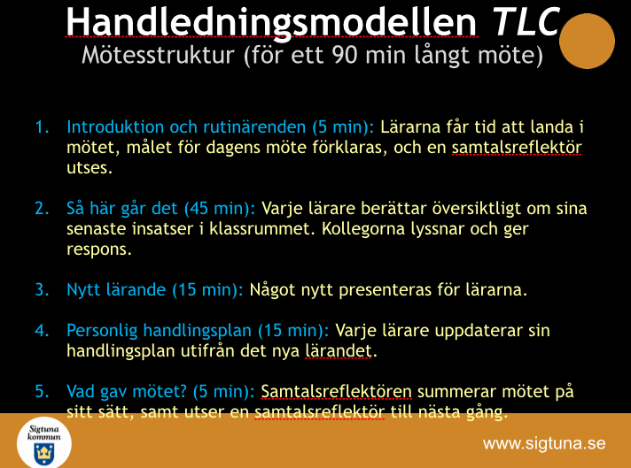 Vi har precis startat upp TLC på vår skola och vi har i vår planering av mötesstrukturen använt oss av sammanfattningen från Sigtuna kommun (se nedan). Vi har planerat att detta ska vara ett långsiktigt arbete och har startat upp sammanlagt sex TLC-grupper på skolan, där jag är samtalsledare i den ena. Totalt har vi tänkt oss att ha tre TLC per termin, och att dessa ska vara frivilliga att delta i. Första gången var dock obligatorisk för alla.